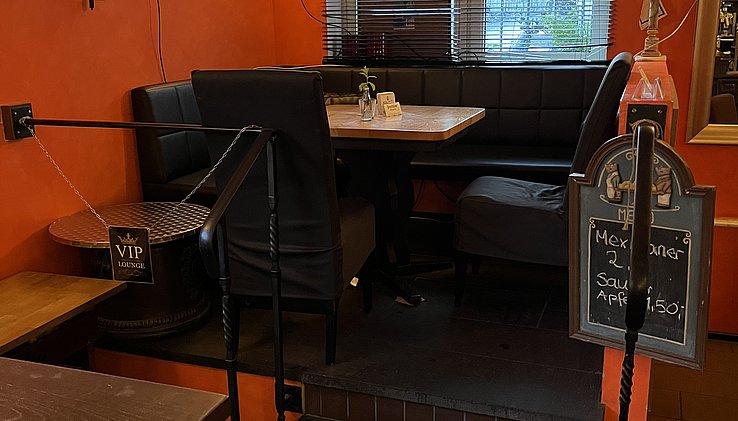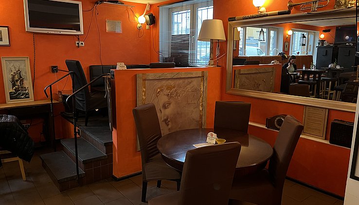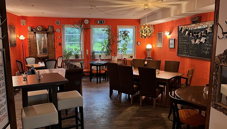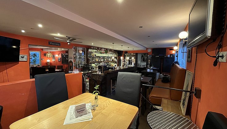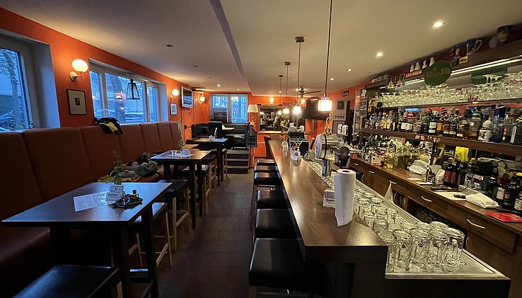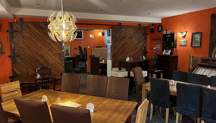 Der Gastraum bietet auf ca. 85qm je nach Bestuhlung Platz für ca. 60 Gäste und verfügt im vorderen Teil über einen gemütlichen Barbereich. Abtrennbar im hinteren Bereich schließt sich ein kleiner Saal an für Feiern und Veranstaltungen.