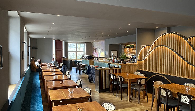 Große Theke und moderne Gastraumgestaltung