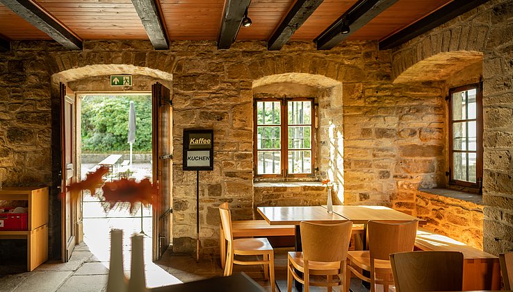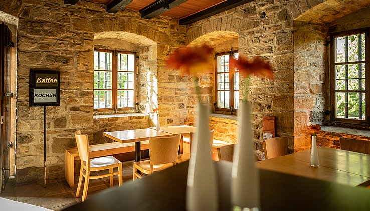 Café Gasthof zur Post im Fachwerkbau mit attraktivem alten Ofen und verglasten Einblick in einen Kutschenstand, Biergarten