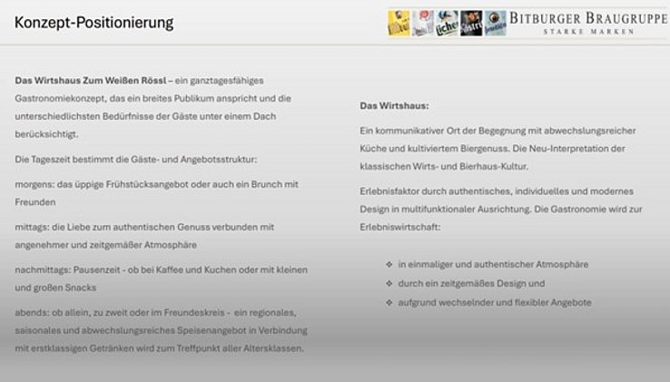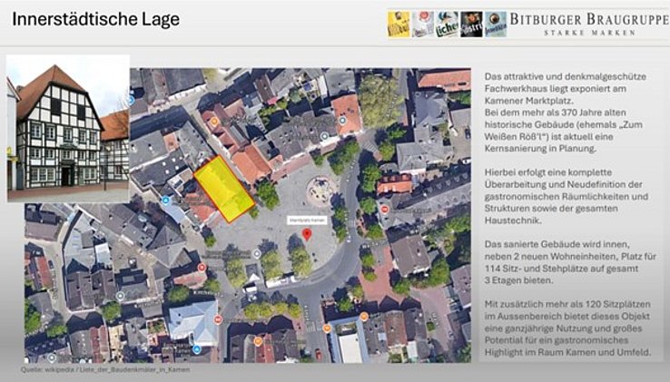 Das attraktive und denkmalgeschützte Fachwerkhaus liegt exponiert am Kamener Marktplatz. Bei dem mehr als 370 Jahre alten historischen Gebäude ("Zum Weißen Rößl") ist aktuell eine Kernsanierung in Planung. Hierbei erfolgt eine komplette Überarbeitung und Neudefinition der gastronomischen Räumlichkeiten und Strukturen sowie der gesamten Haustechnik.