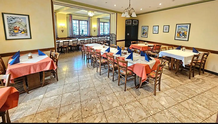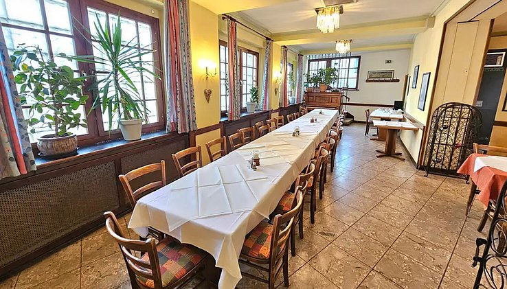 Im hinteren Bereich befindet sich ein Speisesaal, der sich hervorragend für Familienfeiern, Gruppen oder kleinere Veranstaltungen eignet.