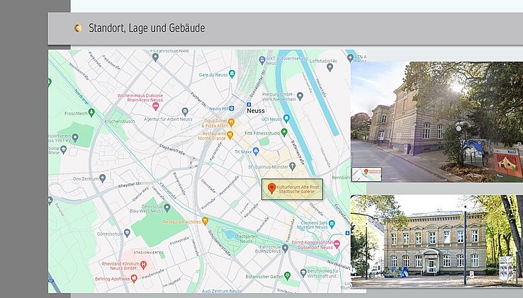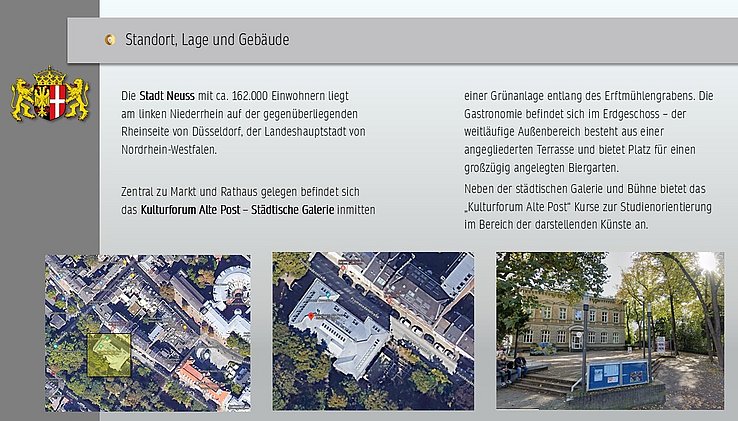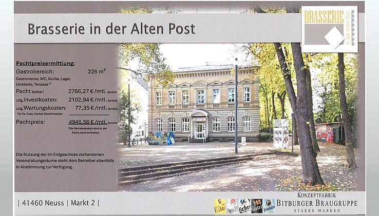Denkmalgeschütztes historisches Gebäude "Alte Post" (Kulturforum der Stadt Neuss). Die Gastronomie wurde in der Vergangenheit gut angenommen. Es gibt ein Gastronomie- und ein Veranstaltungsbereich.