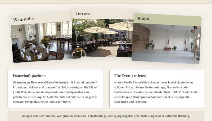 Die 132 m² große Weinstube und das Nebenzimmer verfügen über eine gehobene Einrichtung. Im Außenbereich befindet sich eine große Terrasse, Parkplätze, Keller und Lagerräume.