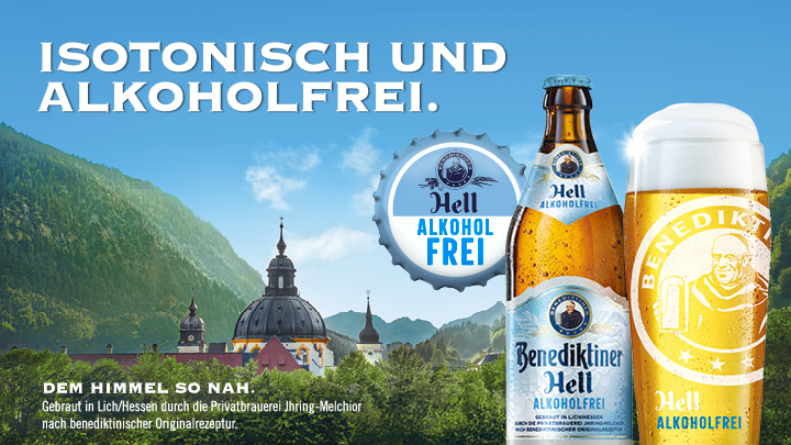 Benediktiner Hell Alkoholfrei überzeugt durch seine mild-frische Geschmacksnote mit angenehmer Malzsüße und ist dabei isotonisch. Inspiriert von den benediktinischen Werten richtet sich das alkoholfreie Hell an aktive und gesundheitsbewusste Menschen, benediktinisch positioniert als ideales Getränk für ein maßvolles gutes Leben.